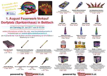 Freunde des Feuerwerks 1. August Feuerwerk Verkauf in Bettlach am 29.Juli !